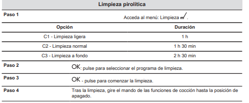 4. Seleccione el ciclo de limpieza pirolítica y la duración del proceso de limpieza.