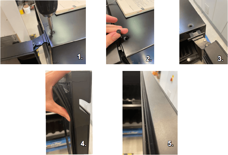 Coloque la puerta sobre un material blando (por ejemplo, un EPS), con el frente hacia abajo y coloque el anclaje de la junta en la ranura de la puerta. Empuje con cuidado el resto de la junta hacia adentro. Vuelva a colocar la puerta.